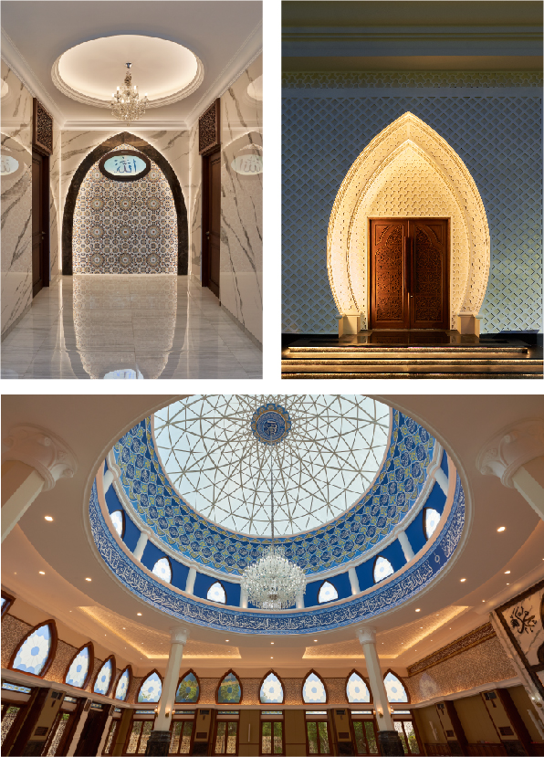 sehingga terlihat indah di malam hari. Bagian kubah yang terletak di tengah tampak terlihat megah dengan motif dan tulisan kaligrafi yang mengelilingi dinding sebagai ornamen klasik yang terinspirasi dari Timur Tengah. Tidak sampai disitu saja, rangka atap yang menggunakan atap kaca dan chandelier crystal menonjolkan kesan terbuka dan megah dengan aksen warna biru muda dan biru tua disekeliling dinding menjadikannya sebagai focal poin di area kubah ini. Selain area ibadah, masjid ini juga dilengkapi dengan ruang gudang, ruang informasi, ruang perpustakaan, dan ruang sound system. Kesejukan ruangan masjid didapatkan dari desain klasik modern yang membuka banyak akses sirkulasi udara, beserta minimnya furnitur interior. Menawarkan ketenangan untuk kekhusyukkan Beribadah Bagi orang-orang di dalamnya. Perasaan kedekatan dengan Sang Pencipta terbangkitkan dari keheningan di dalam ruangan Masjid ini.